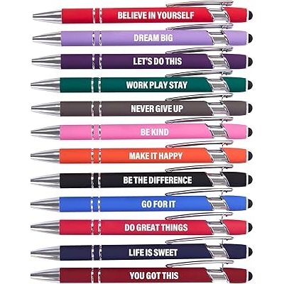 Funny Pens - 12 Pack Fine Point Smooth Writing Pens with Inspirational Tips, Black Ink, Touch Stylus Screens, Motivational Gift for Office & Desk Accessories